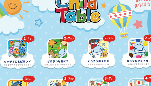 オリジナルのホーム画面は、小さなお子様でも楽しく、直観的にアプリを選べる特大アイコンを設置しています。対象年齢等も分かりやすくあしらわれているので、ストレスなく遊んでいただくことができます。